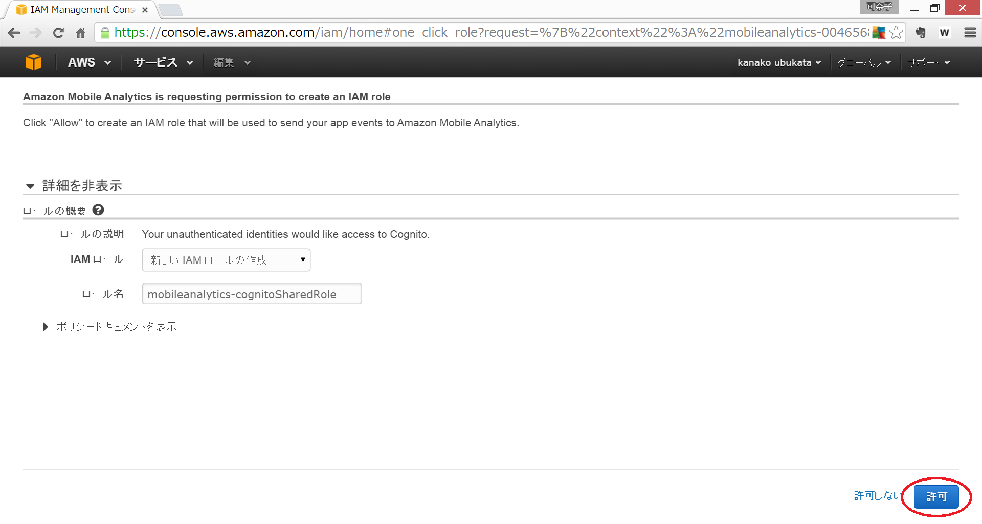 次に、アプリからAmazon Mobile Analyticsにアクセスするための権限作成画面が表示されます。