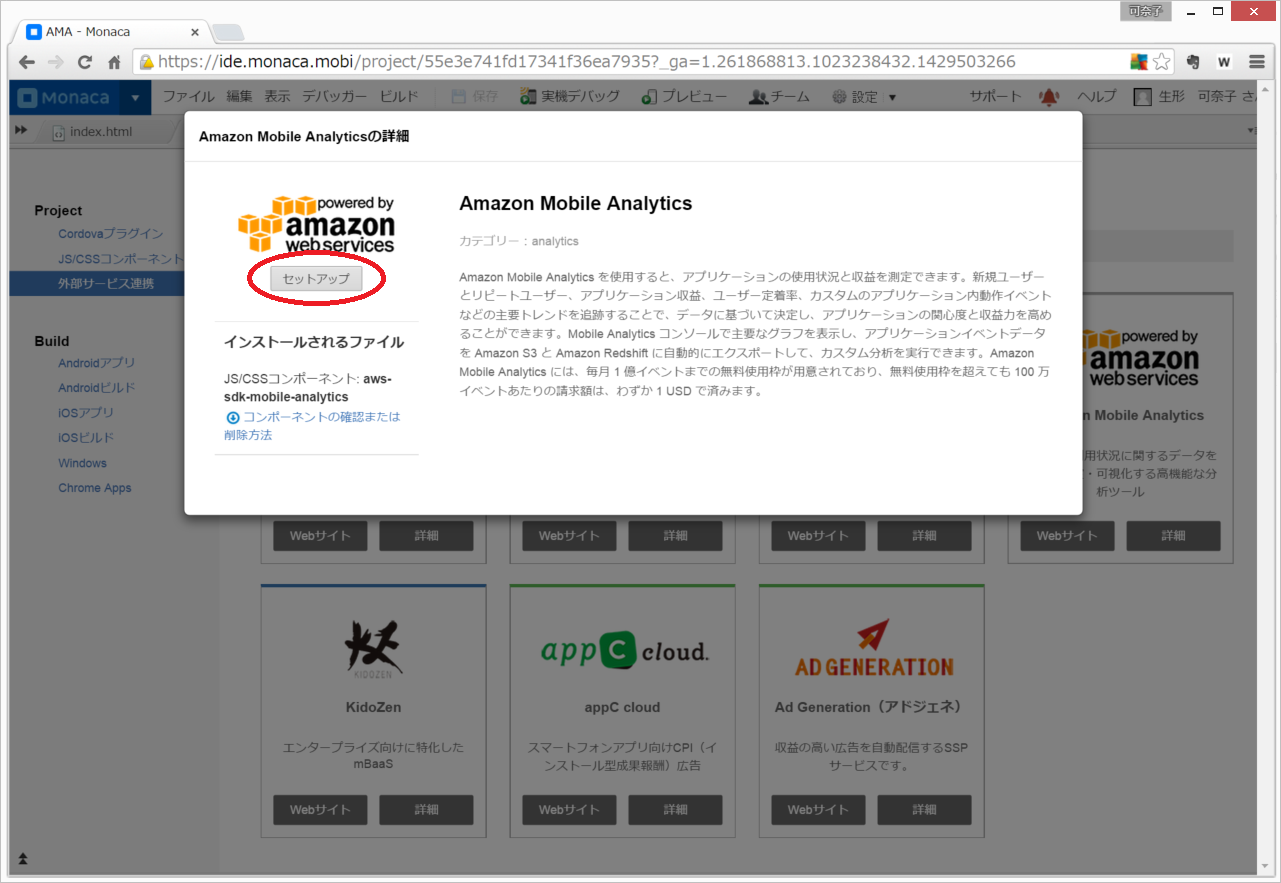 Amazon Mobile Analyticsの「詳細」ボタン>「セットアップ」ボタンの順に選択してください。
