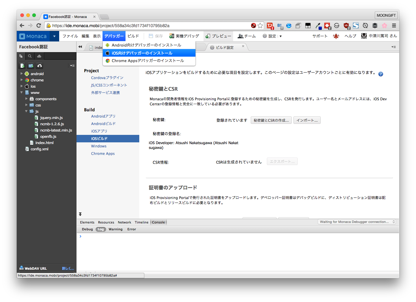 そしてデバッガーメニューからiOS向けデバッガーのインストールを選択します。Androidの場合はAndroid向けデバッガーのインストールを選択してください。