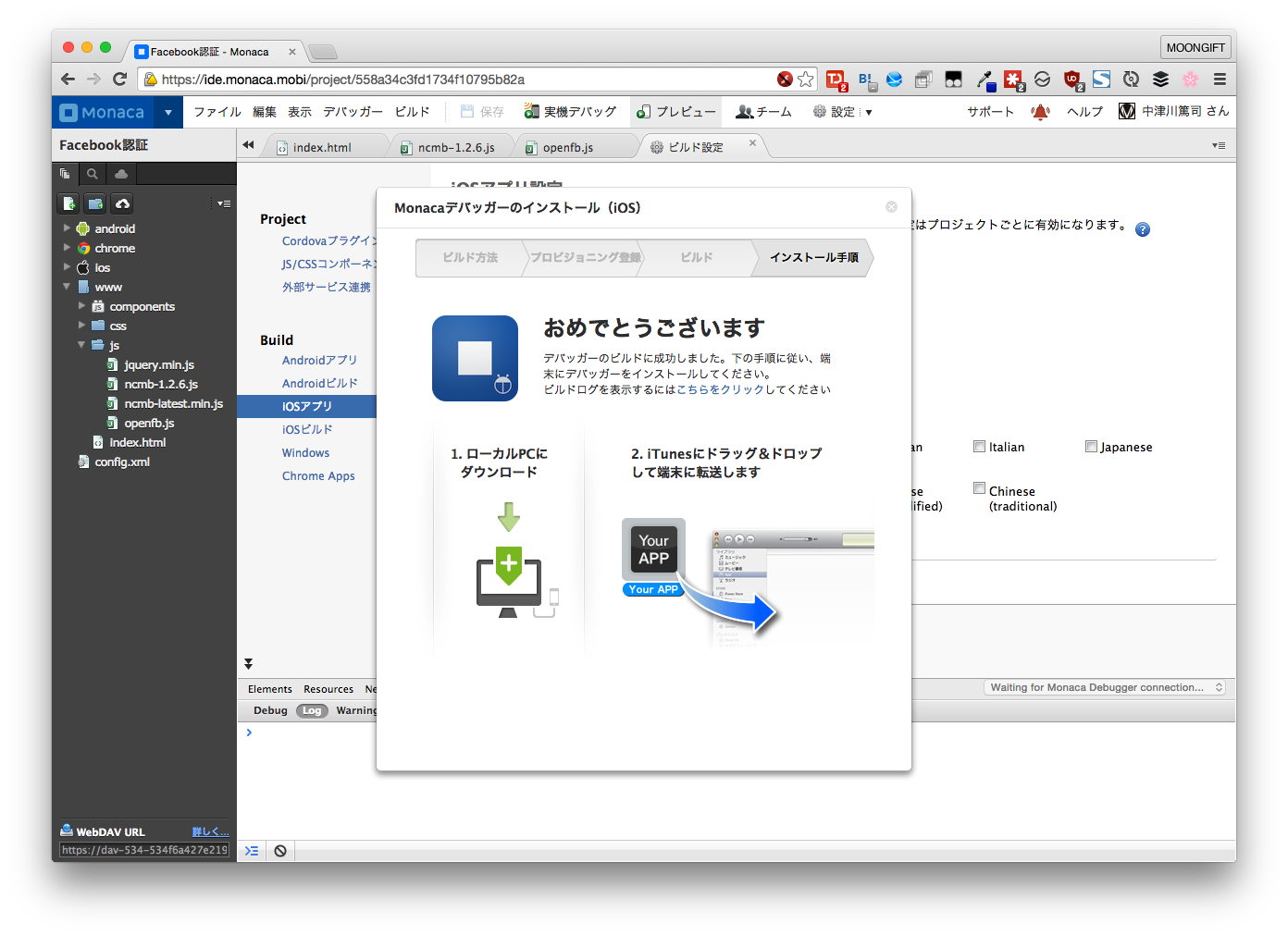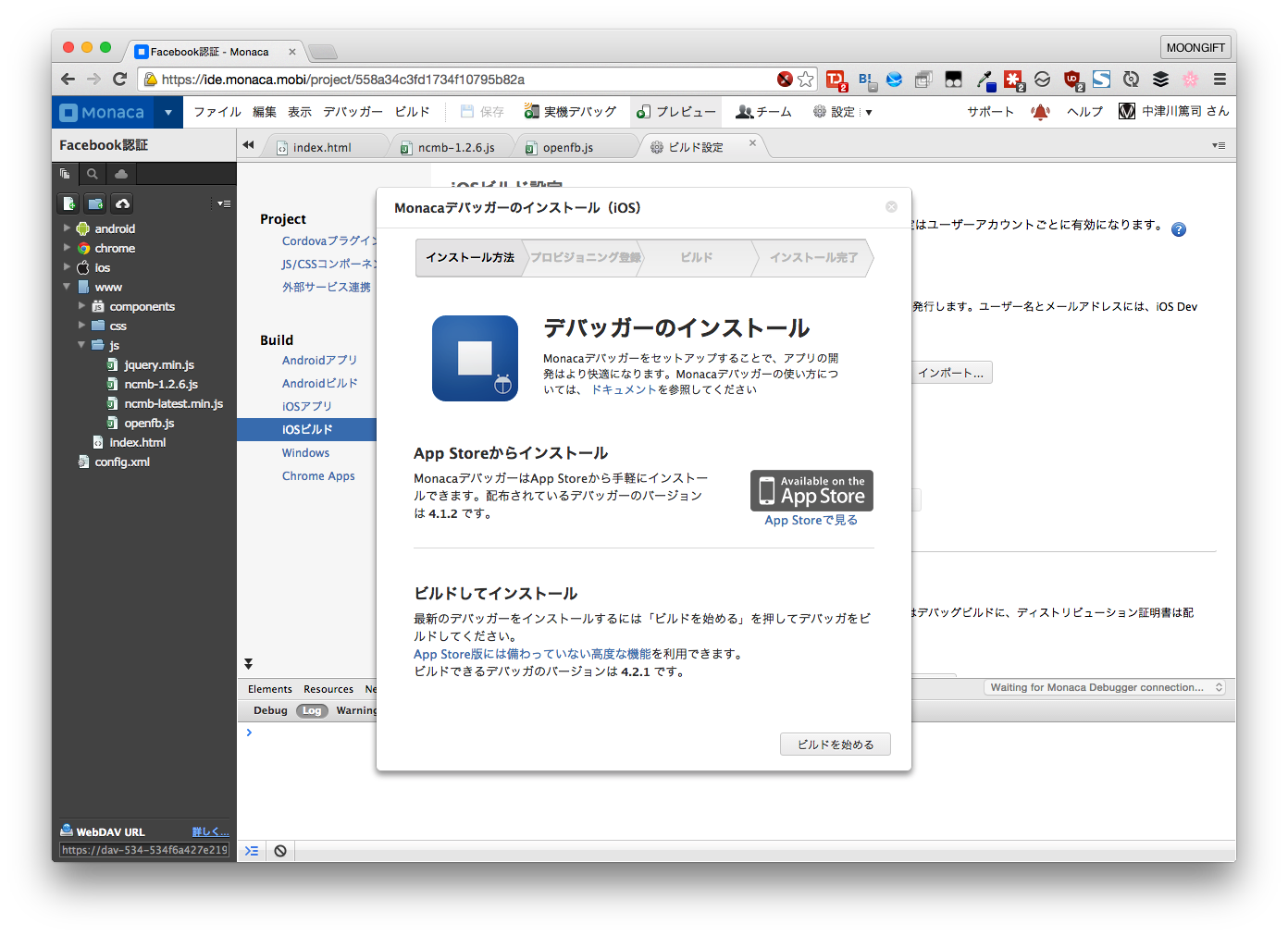 アプリをデバッグビルドすることもできますが、コードを編集するたびにアプリをインストールし直すのは手間がかかります。そこで今回はMonacaデバッガーのカスタムビルド版を紹介します。