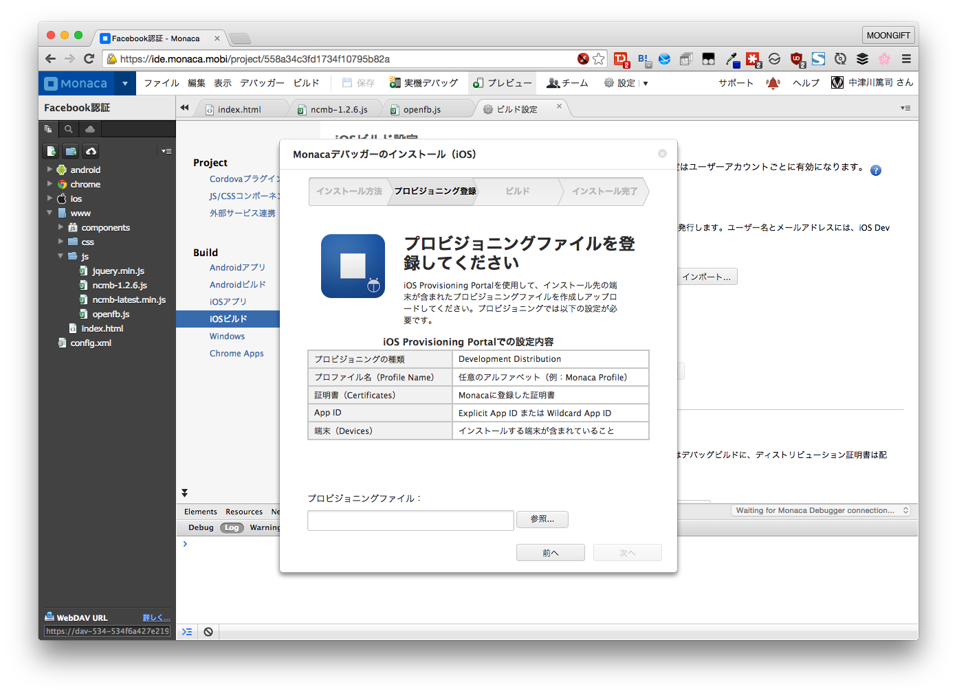 ビルドする際にはプロビジョニングプロファイルが必要です。iOS Dev Centerであらかじめ作成しておいてください(iOSの場合)。
