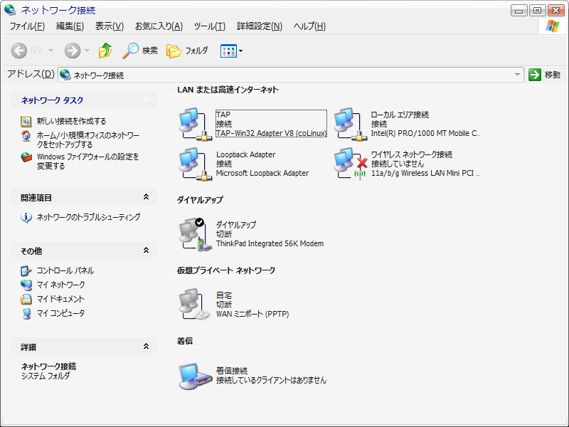 そこではTAP-Win32を選びインストール、そして、上記のようにインストールされたTAP-Win32をTAPという接続名に変更しています。
