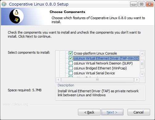 ちなみにcoLinuxのインストール時にインストールするネットワークドライバを選択できるようになっていますが、