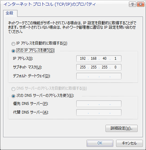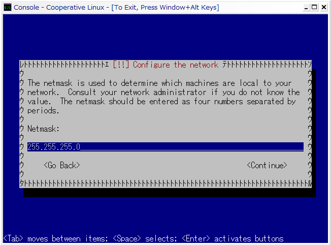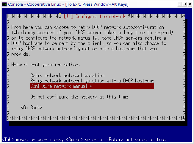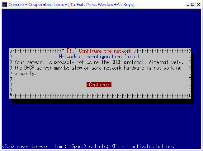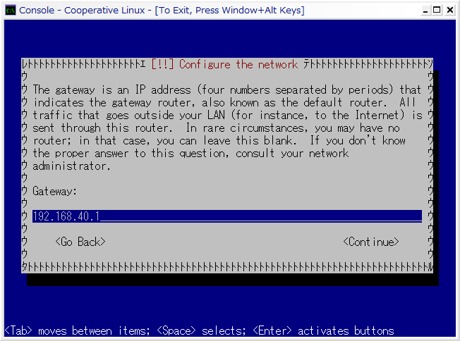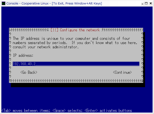 ここでContinueを選択して次の画面でConfigure network manuallyを選択してIPアドレスを手動で入力します。先のTAPの設定でTAPのIPアドレスを192.168.40.1に設定しているので、coLinuxには192.168.40.2を割り当ています。