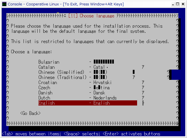 この最初の画面では言語を選択するわけですが、日本語が化けるのでEnglishを選択し、次の画面ではotherを選択でJapanを選択します。このあたりも以前書いたetchのインストールと同じです。