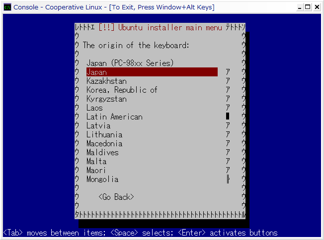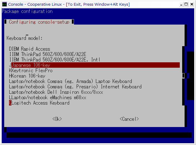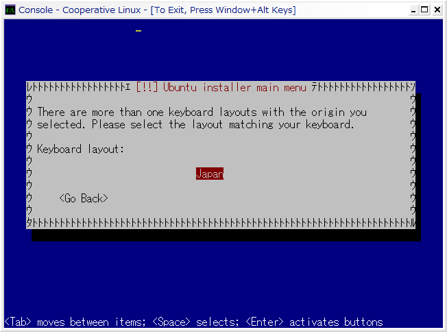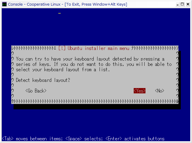 Detect keyboard layout?ということで、Yes/Noの選択を迫られている先ほどの画面に切り替わるので、ここではNoを選択し、キーボードは日本語キーなのでJapanを選択します。