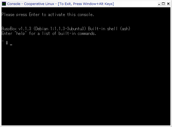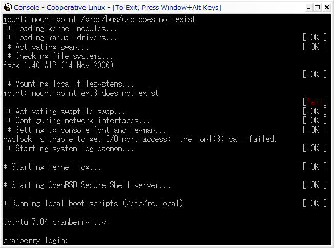 こんな感じの設定ファイルでcoLinuxを起動すると無事Ubuntu 7.04が起動するはずです。