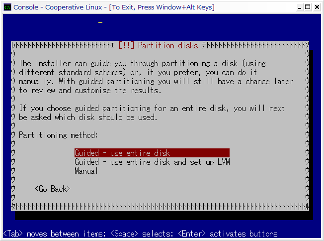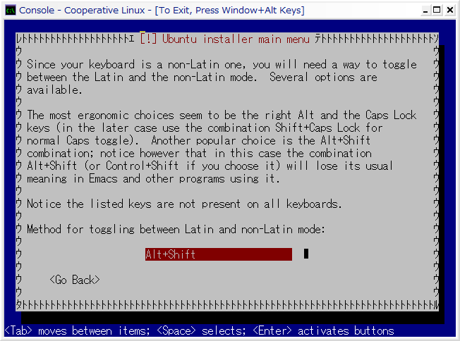 上記コマン ドを実行したら、Alt+F1を押してコンソールを切り替えセットアップ画面に戻ります。