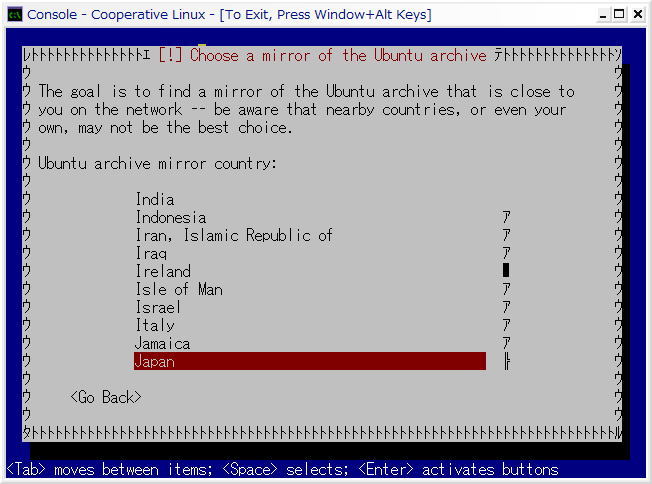 これが終わるとインストール元となるミラーを選択する画面になります。