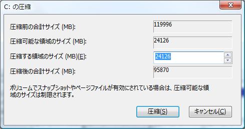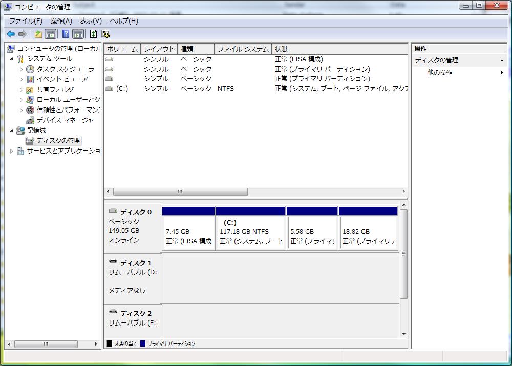 インストールするにはまずパーティションを空けなければなりません。(type TZは購入するときに構成をカスタマイズすることができます。私の場合ストレージとして2.5インチの160GBのハードディスクだけ、いわゆる1スピンドルという構成)。Vistaでは管理ツールのディスクの管理でパーティションを操作することができます。