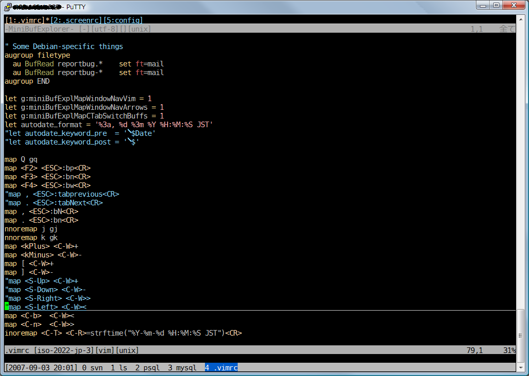 ちなみ、使用しているpluginで欠かせないのはminibufexpl.vimです。これは現在使用しているバッファを画面上部にリスト表示してくれます。各バッファをタブのように切り替えることができます。Vim7からはタブに対応しているわけですが、私的にはこちらの方が使い勝手が良いです。