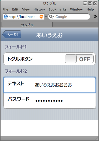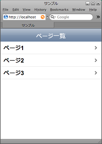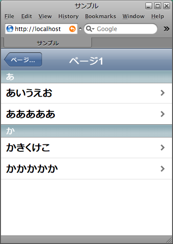 ほぼサンプルそのままですがこんな感じになります。クラス名toolbarというのがページ上部に表示されているタイトルや戻るボタンが表示される場所になります。そして、ul要素でリストを作成しtitle属性はそのページのタイトルになります。また、クラス名toggleを使うとトグルボタンを作成したりすることができます。