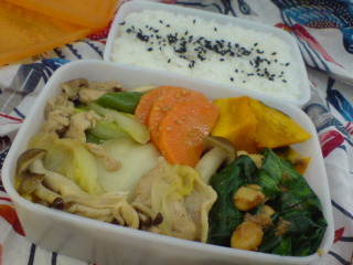 白菜のオイスターソース炒めとほうれん草の大豆土佐漬けの和え物、にんじんのごま煮、ボイルしたかぼちゃです。ご覧のように基本的に和食といいましょうか、一応炒め物に豚肉が入ってはいますが野菜中心のお弁当です。