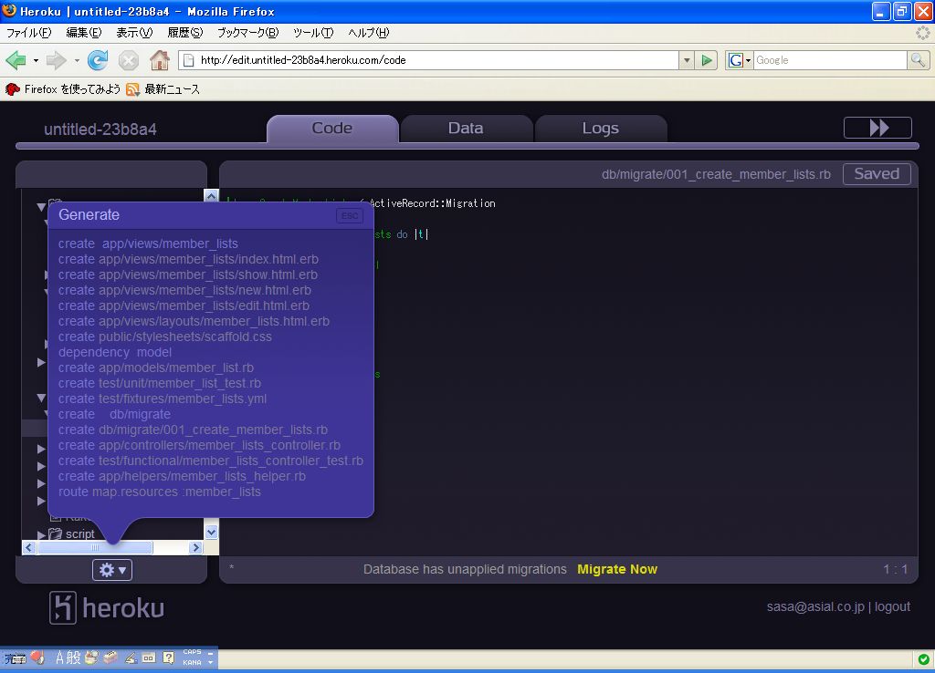 しかし、コードの編集やアプリケーションの実行、データベースの編集、 scaffold生成や migrationの実行まで、すべてブラウザ上で行えるという特徴をもっています。