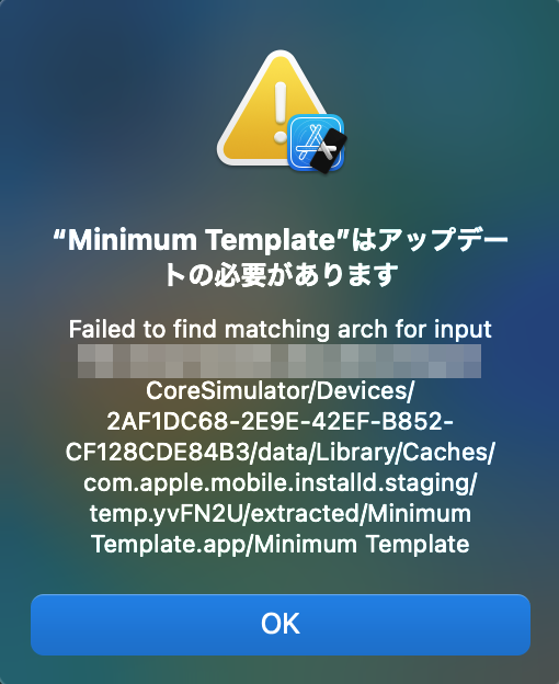 AppleシリコンのMacでシミュレータービルドを行った場合は、Appleシリコン用のアプリが作成されます。IntelプロセッサのMacの場合は、Rosettaのようなツールが提供されていないため、Appleシリコン用のアプリは、IntelプロセッサのMacで動作するシミュレーターでは、実行させることができません。IntelプロセッサのMacで動作するシミュレーターにAppleシリコン用のアプリをインストールした場合は、スクリーンショットのようなエラーが出力されます。