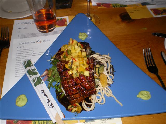 この料理、確かに内側は生魚ですが、外側はこれでもか!というくらい胡椒をまぶして焼いてあります。右からモサっとはみ出しているモノはメニューによると「UDON」ですが、茹でてないラーメンの味がします。そして上に乗せられているのは野菜とパイナップルの炒め物。それらにひたすらしょっぱい「TERIYAKI SAUCE」がかけられています。う~ん、This is America!