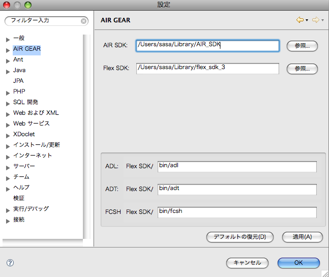 Eclipseを起動して設定メニューに新しく追加された「AIR GEAR」に先ほどダウンロードしたSDKの場所を指定します。