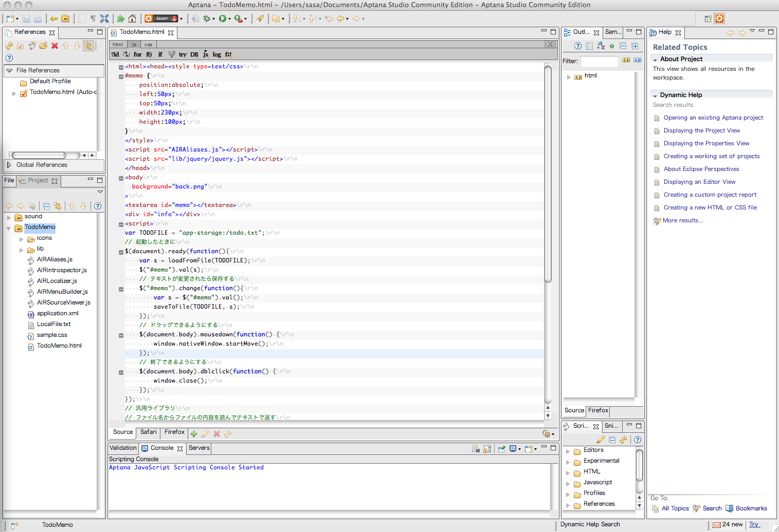 いろいろ調べていると「Aptana」というアプリケーションを見つけました。さっそくインストールしてFLEXベースではなく簡単に作成できるHTMLベースでさくっとAIRアプリを作成してみました。