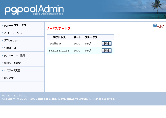 最後おまけで、、pgpoolにはpgpoolAdminというウェブ管理ツールがあります。初期設定は設置後/install/にアクセスして行え、各ノードの確認や設定ファイルの変更が簡単にできたりと便利です。ソースはpgpoolと同様pgfoundryからダウンロードできます。