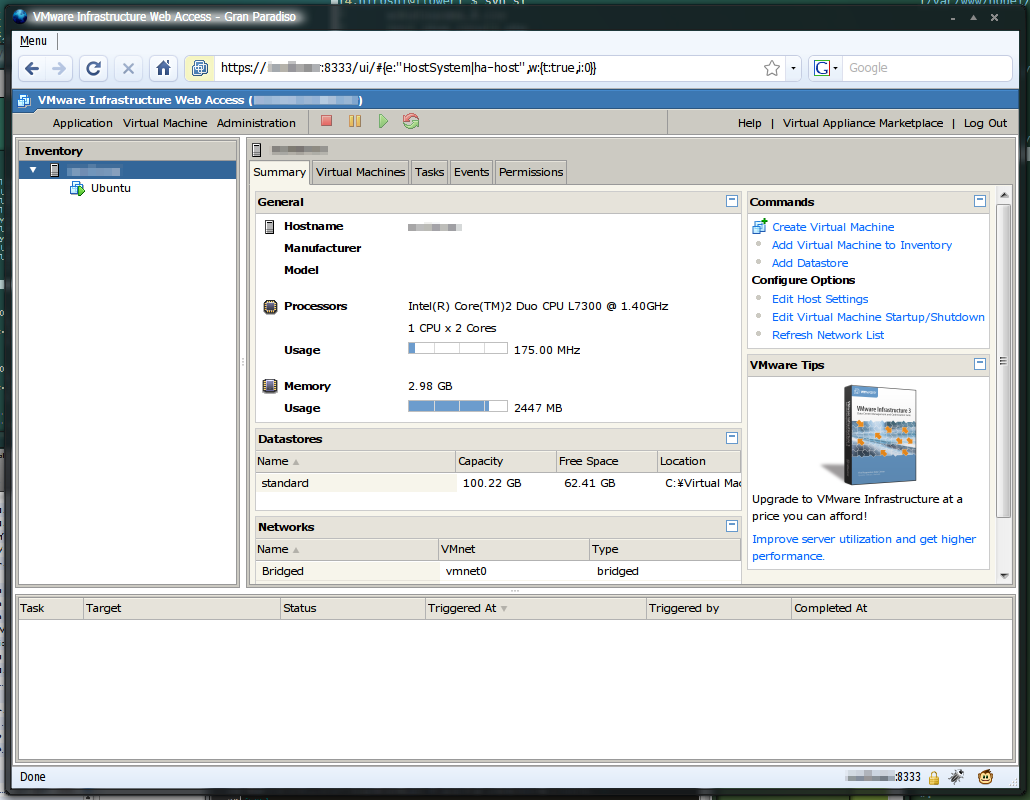 当初はWebインターフェースになって重くなった等々マイナスな面ばかり目に入ったのですが、VMware Server Web Accessを起動しないようにし、直接仮想マシンをいじる必要がある場合のみ作成したショートカットでコンソールを起動するようにすれば、重くなった云々という私が思っていたマイナス面が解決されます。VMware Server 2,0、素晴らしいですね!
