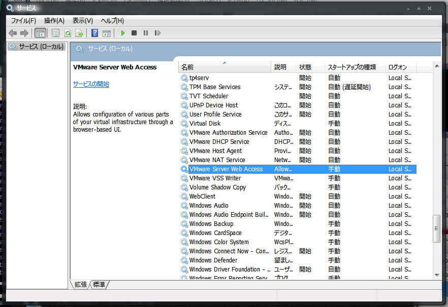 私の場合、普段Webインターフェースのあの管理画面はほとんど使用することがないので、Windowsのサービスの画面からでVMware Server Web Accessを手動にして普段は起動しないようにしています。