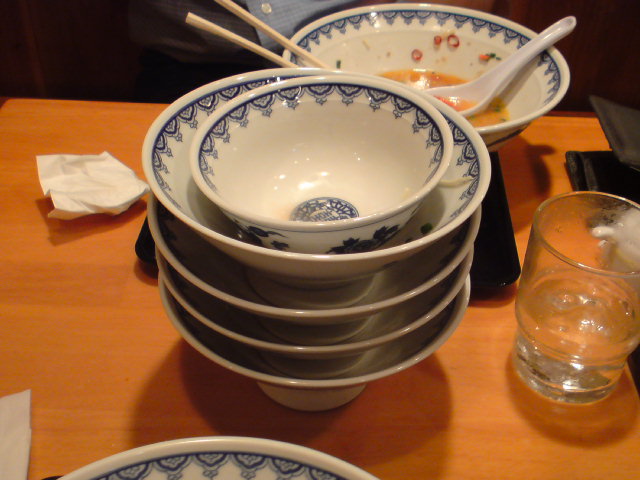 普段は200円プラスで替え玉食べ放題なのですが、たまに無料になる期間があり、どんぶりを積んでいる写真はそのときに社員何人かでいってきたときのものです。
