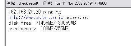 これだけです。あとは、この監視スクリプトをcronで定期的に実行するようにしておけば、監視結果がメールで送られてくるようになります。