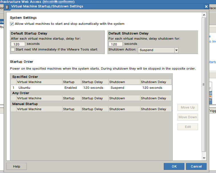 表示されるウインドウの中にある「Allow virtual machines to start and stop automatically with the system」にチェックを入れ、そのほかの項目を好みで変更することにより、ホストマシンの起動時に仮想マシンも一緒に起動、終了時にサスペンドという動作を設定することができるようになります。