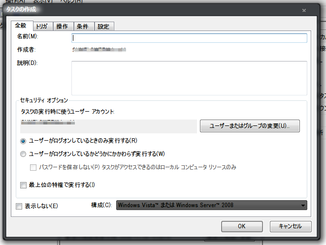 タスクスケジューラの右側にある「操作」の「タスクの作成」から新しいタスクを作成し ます。まずは[全般]の名前の部分に適当な名前を入力し、[トリガ]にてこのタスクを実行するためのトリガを作成します。