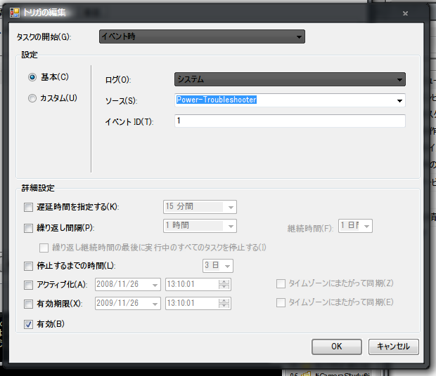 ソースの部分で指定している「Power-Troubleshooter」というものが重要でサスペンドや休止状態から復帰したときにシステムのログにこの情報が記録されます。それをトリガとして利用するわけです。
