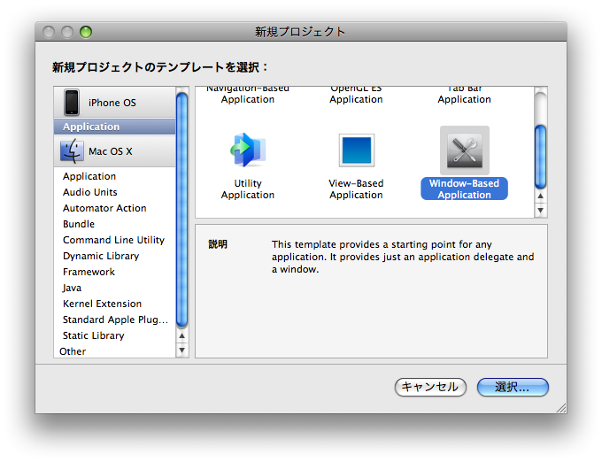ここで、iPhoneOSのApplicationカテゴリの中から、[Window-Based Application]を選択し、プロジェクトの名前を付けてください。ここではsamplePrjという名前で作成します。