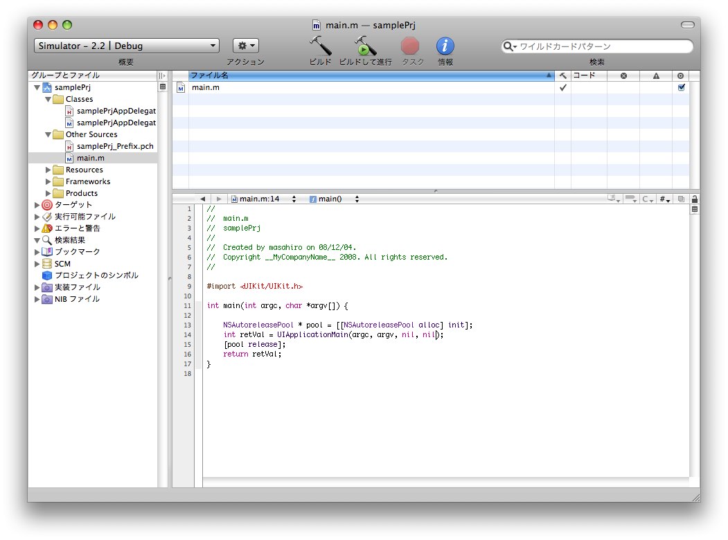 この中で呼び出されているUIApplicationMain関数がiPhoneアプリケーションのフレームワークであるUIKitを呼び出すメソッドになっており、この関数内から、プロジェクトのClassesグループツリー内にあるxxxxAppDelegateというオブジェクト(ここではsamplePrjAppDelegate)が呼び出されます。