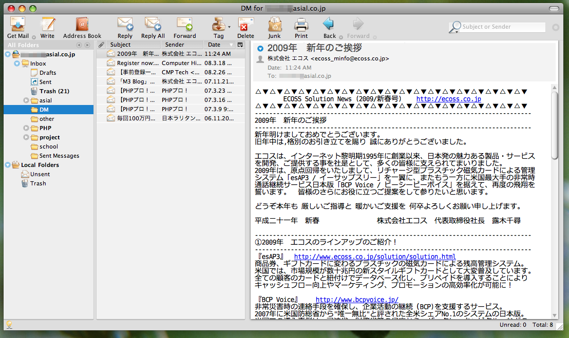 以前はOSX標準のMail.appを使用していたのですが、使い難いというかやはり使い慣れたメーラーが一番ということでこれに戻ってきました。
