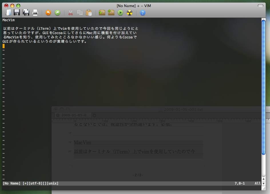 以前はターミナル(iTerm)上でvimを使用していたので今回も同じようにと思っていたのですが、GUIをCocoaにしてさらにMac用に機能を付け加えているMacVimを知り、使用してみたところなかなかいい感じ。何よりもCocoaでGUIが作られているというのが素晴らしいです。