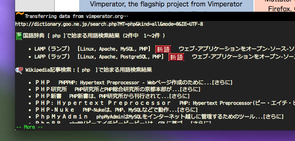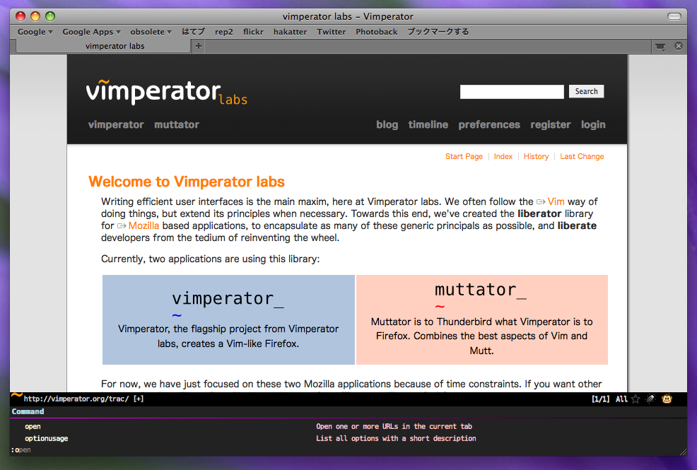 日々Vimを用いて開発を行いそのキー操作にどっぷり浸っていると他のアプリケーションでもそのキー操作で操作をしたくなってきます。そこで、画面表示確認等々でVimと交互に行ったり来たりするFirefoxでもそれと同じ操作ができるVimperatorを使わなければ!と思いここ最近使用しています。