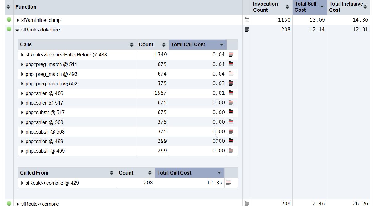 WinCacheGrindでは、関数の呼び出しが階層化されていて、ダブルクリックで下の階層に移っていくことができますが、webgrindでは階層化されていません。