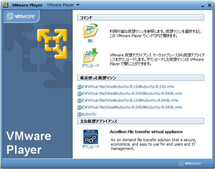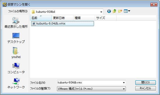 起動したらこの画面が表示されるので『仮想マシンを開く』からubuntu-8.10d.vmxを開きます。