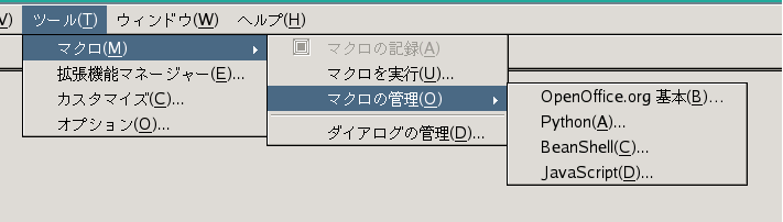 以下の図からOpenOffice.org BASIC(基本。。。てすごい訳ですねw)のエディタを選んで、適当なファイル(今回はStandard/Macro1)に以下のようなコードを登録します。
