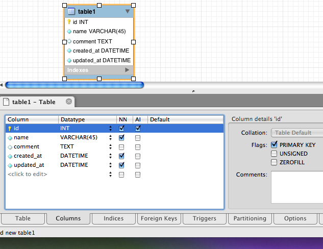 テーブルのオブジェクトが作成されます。あとはこのオブジェクトをダブルクリックすると下にTableエディタが開くのでここでからカラムを追加していきます。