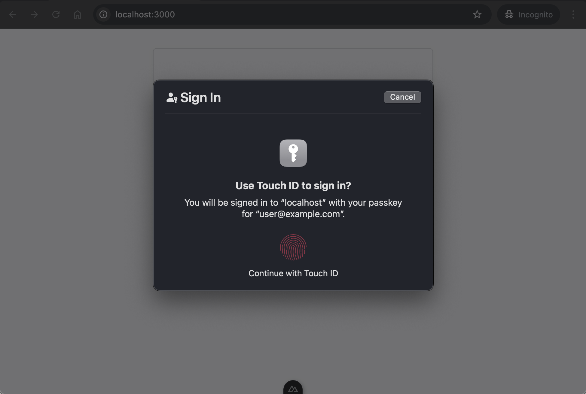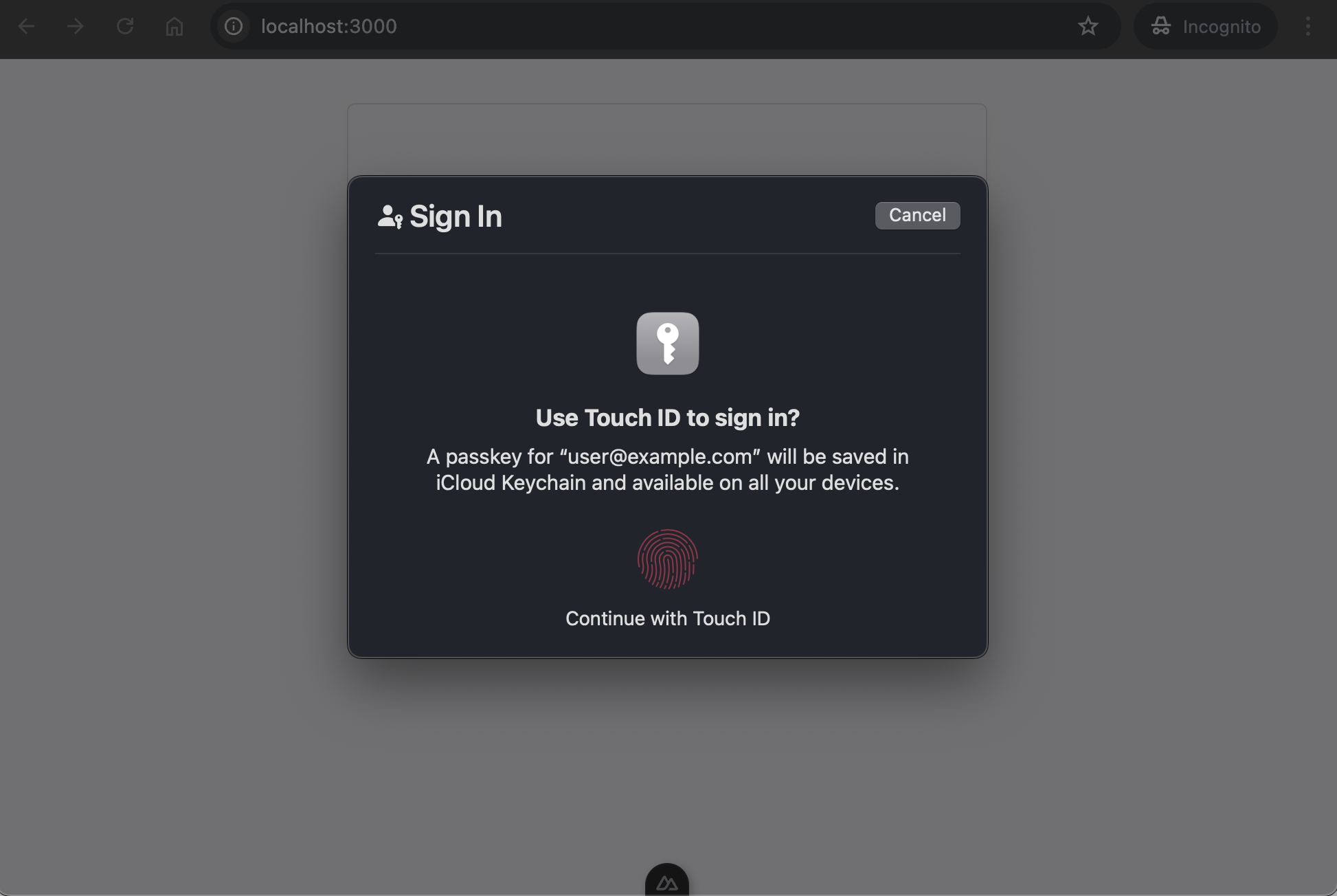 PublicKeyCredentialRequestOptionsを使ってSimpleWebAuthnのstartAuthentication()を呼び出すstartAuthentication()は内部的にはnavigator.credentials.get()を呼び、認証器に認証情報をリクエスト- 認証器により認証が要求されるので認証する
