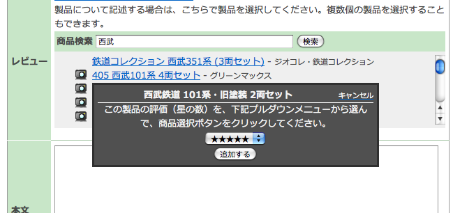 '<div>この製品の評価(星の数)を、下記プルダウンメニューから選んで、商品選択ボタンをクリックしてください。</div>' +