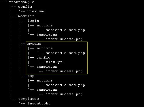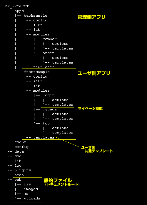 symfonyでは、MY_PROJECT/appsの中のように、アプリごとにディレクトリが作られ、各アプリ内のmodulesディレクトリに機能ごとのディレクトリができます。