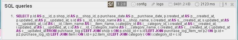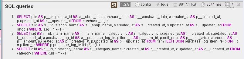 Joinメソッドを書いておかないと1つのデータを表示する度にSQLが実行されます。(上の結果は、表示するデータが1件の場合です。)