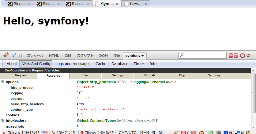 このようにWebDebugツールバーの代わりにFirebugのコンソールにsymfonyタブが追加され、情報が出 るようになります。