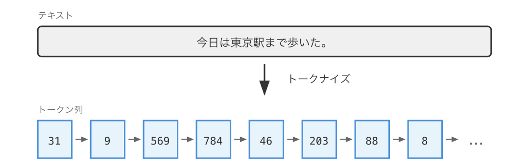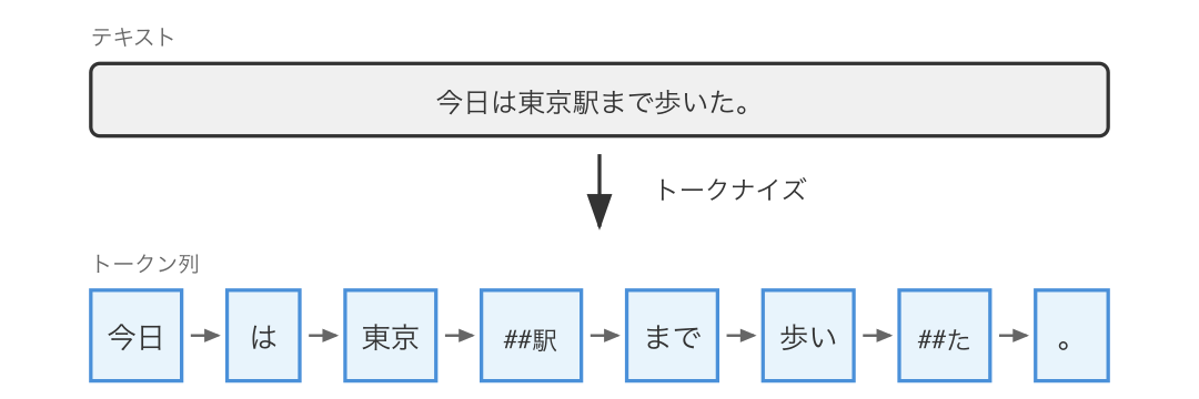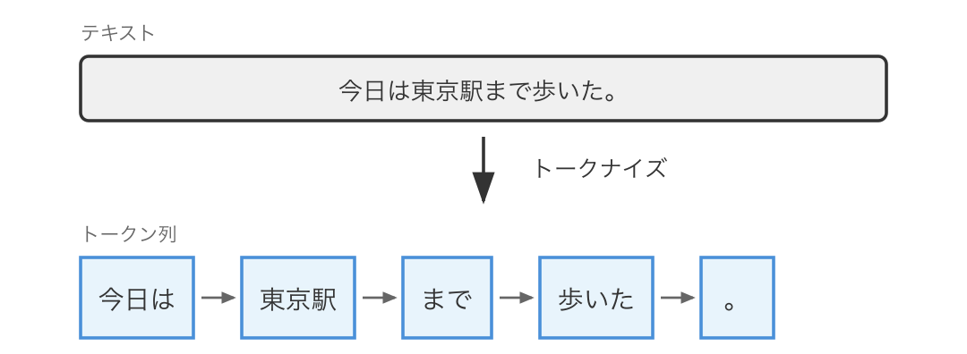上の図には書かれていませんが、トークナイズを行うツールを トークナイザ (tokenizer) と呼びます。