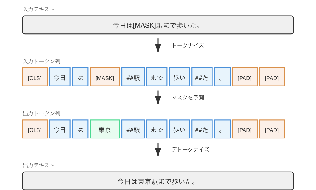 BERT は「次の単語を予測する」GPT とは異なり、「マスクされた単語を予測する」という双方向の学習を行います。この設計のために [MASK] という特殊トークンが必要でした。