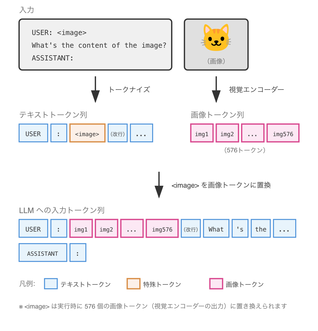 この記事では代わりにオープンに公開されたマルチモーダル LLM を通して画像入力用の特殊トークンを説明していきます。
