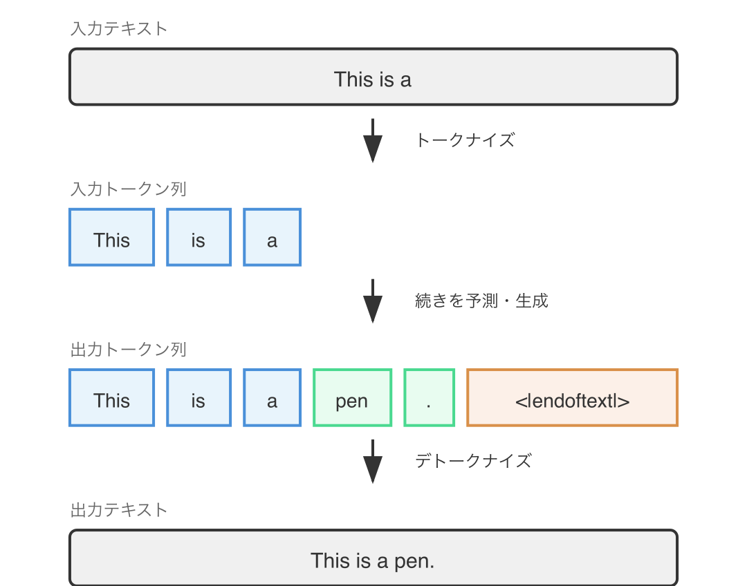 言語モデルはテキストを トークン (token) という単位に分割して処理します。トークンは必ずしも単語と一致するわけではなく、単語の一部分や文字、バイト列の場合もあります。