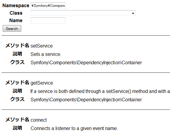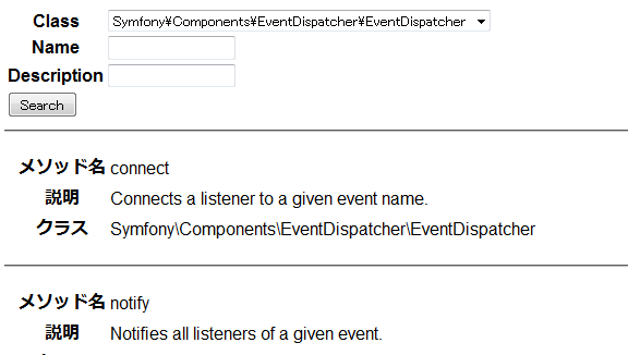 今回はサンプルとして、symfonyのメソッドを検索するフォームを作ります。sfClassはクラス、sfMethodはメソッドです。