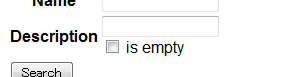 まずはウィジェットとバリデータの定義が違います。入力された値の使い方が違うのでこれは当然ですね。フォームフィルター側のnameとdescriptionのウィジェットがsfWidgetFormFilterInputになっていますが、これはフォームフィルター用のウィジェットです。with_emptyオプションをtrueにすると、値が空であるかどうかを判定するためのチェックボックスが付くようになります。試しにdescriptionに対してwith_emptyをtrueに設定してみると、ブラウザでは以下のようになります。
